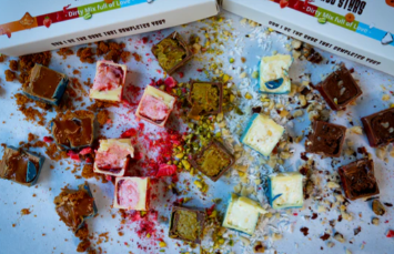 Chaque cube a un goût différent : pistache crémeuse, folie caramel, bueno coquin, cheesecake aux fraises et bien plus encore, le tout recouvert de riche chocolat au lait belge et fini avec ce croquant de pâtisserie kataifi signature.
