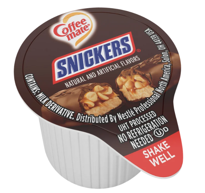 Peel open one tub and pour directly into hot or iced coffee, then stir. Add one for a hint of candy-sweetness or two for a richer Snickers profile. Ideal for travel mugs, office breaks, or when you want indulgence without carrying a large creamer bottle.